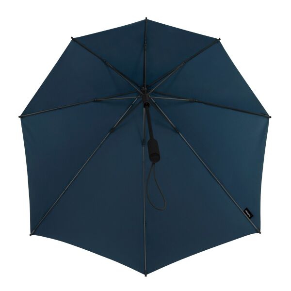 De aërodynamische stormparaplu met de brede achterkant voor maximale bescherming tegen regen..